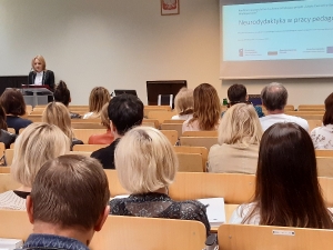 Uroczystego otwarcia konferencji w imieniu JM Rektor AJP prof. dr hab. Elżbiety Skorupskiej-Raczyńskiej dokonała prof. AJP dr hab. Agnieszka Niekrewicz, dziekan Wydziału Humanistycznego, która przywitała uczestników i przybliżyła zakres tematyczny spotkania. Merytoryczną część obrad otworzyło wystąpienie prof. AJP dr Doroty Skrockiej na temat „Neurodydaktyka vs dydaktyka. Spór o nauczanie?”. Prelegentka zwróciła uwagę na niezwykłą popularność, jaką w ostatnich latach zyskały pojęcia z przedrostkiem neuro-. Zauważyła, że użycie semantyki neurobiologicznej sugeruje większą efektywność, ponieważ bardziej ma odpowiadać potrzebom i preferencjom ludzkiego mózgu. Tymczasem, jak podkreśliła, dostrzeganie biologicznych uwarunkowań funkcjonowania człowieka nie jest niczym nowym w psychologii i pedagogice. Przestrzegła przed traktowaniem neurodydaktyki jako nowej alternatywy w nauczaniu. Wystąpienie zachęcało do refleksji, naukowej ostrożności i dyskusji.